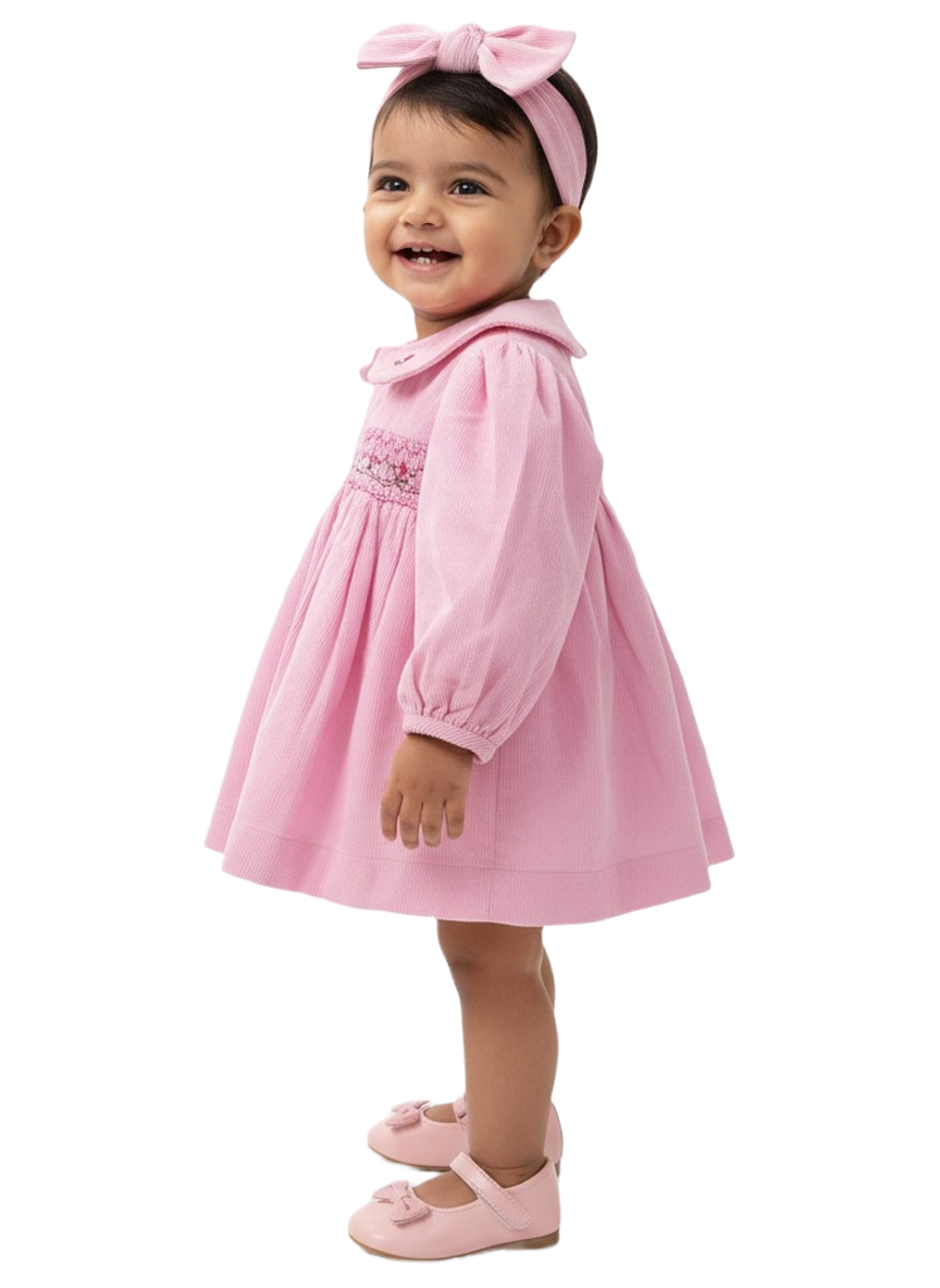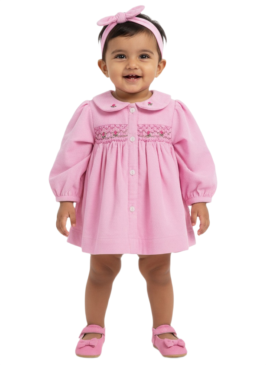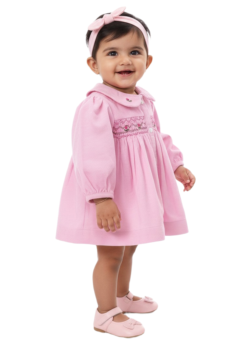 A charming soft-bABY pink baby girl dress crafted from gentle cotton fabric, featuring delicate smocking embroidery and a classic Peter Pan collar. Designed for comfort, elegance, and everyday cuteness.