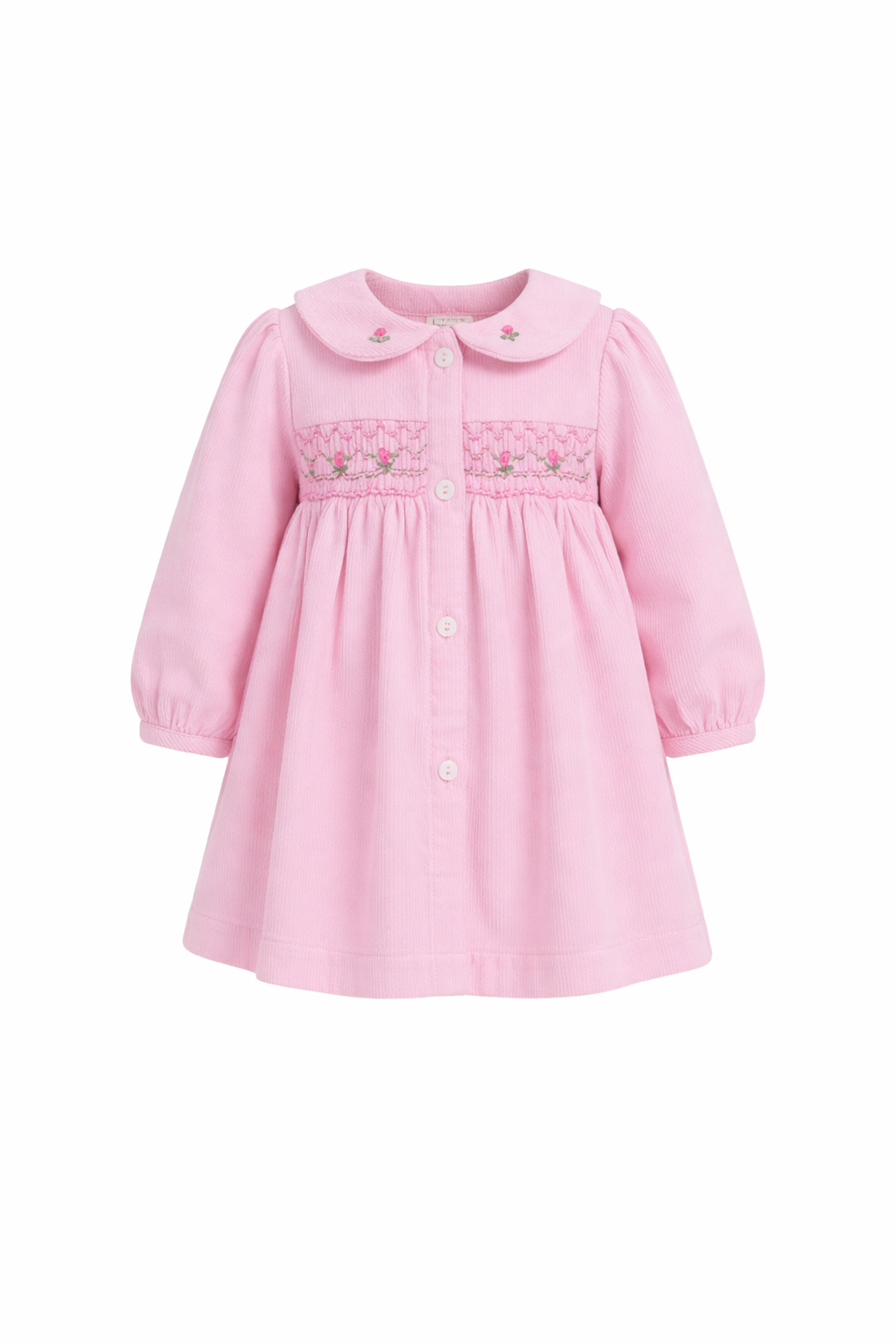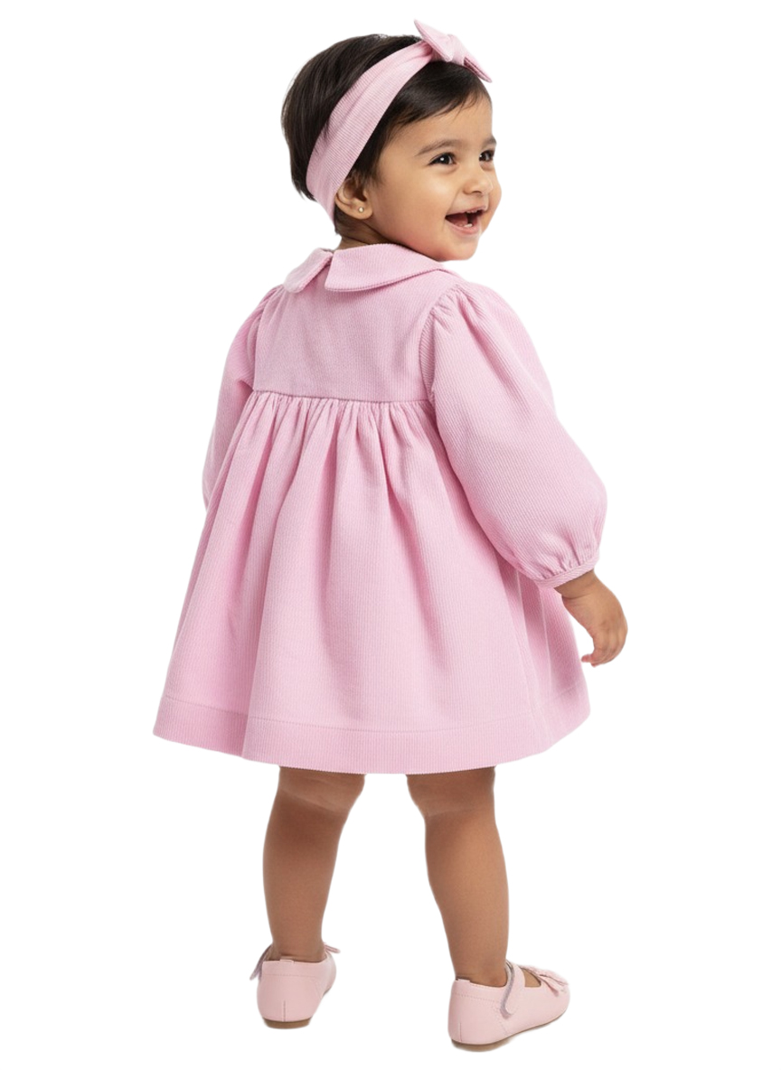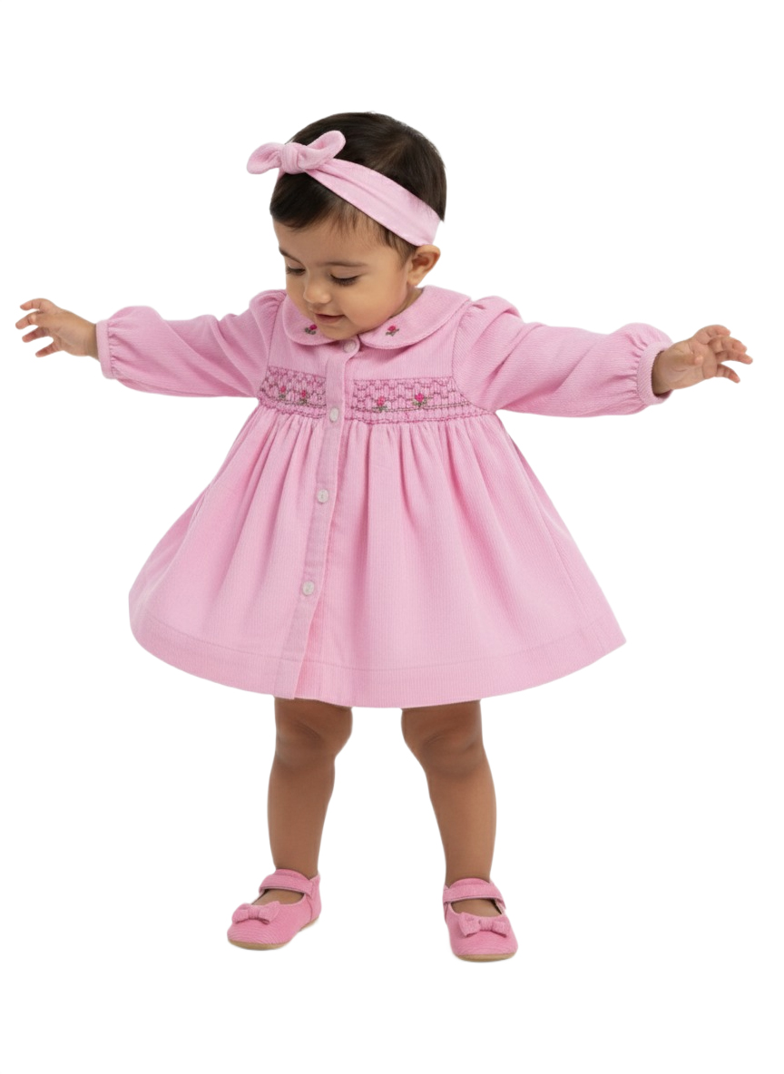 A charming soft-bABY pink baby girl dress crafted from gentle cotton fabric, featuring delicate smocking embroidery and a classic Peter Pan collar. Designed for comfort, elegance, and everyday cuteness.