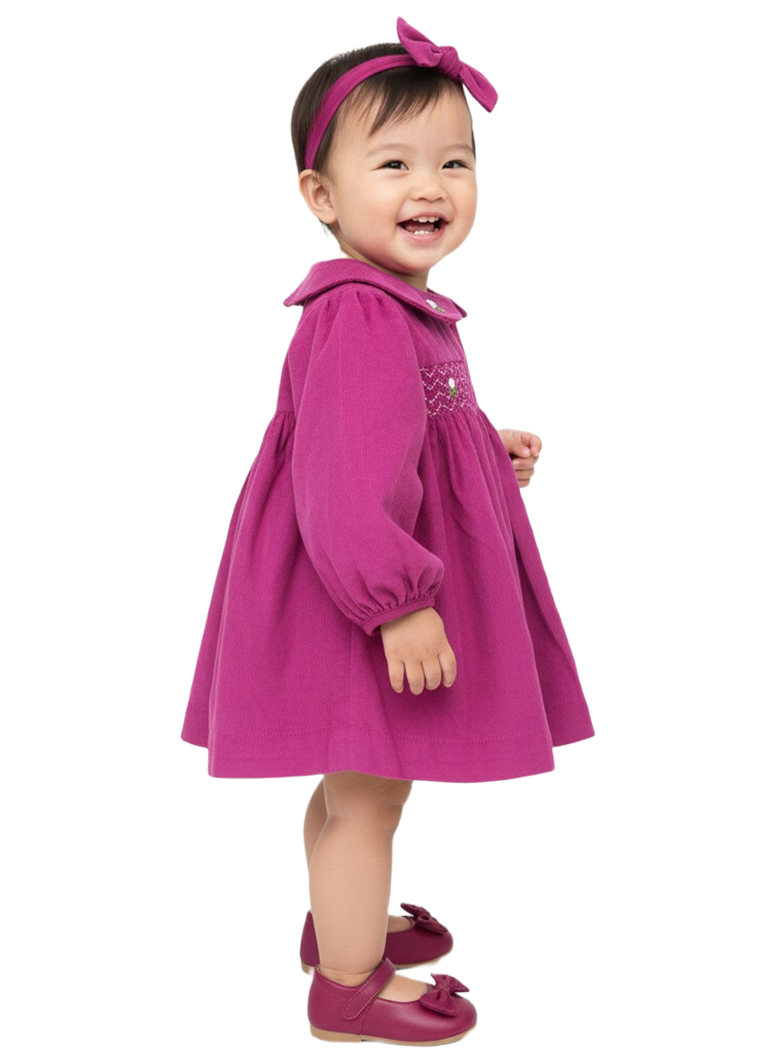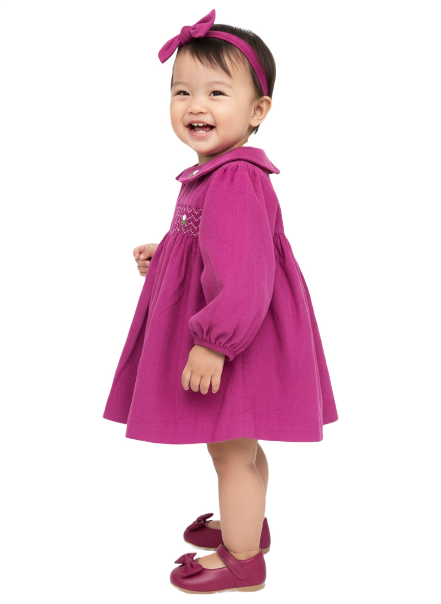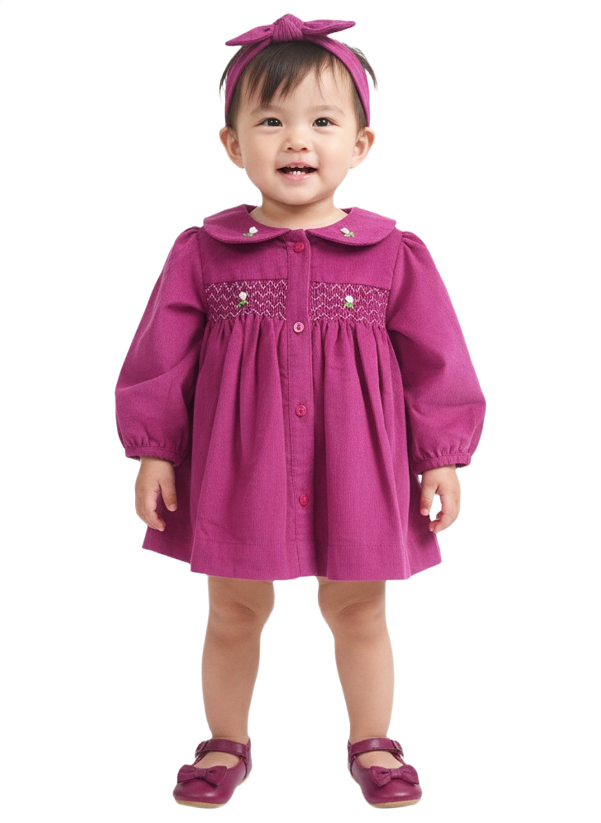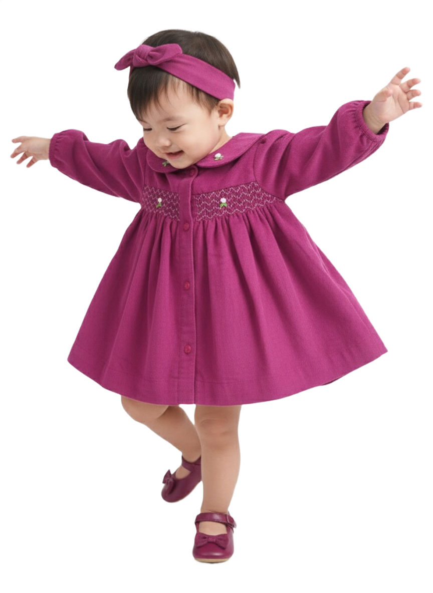 A charming soft-pink baby girl dress crafted from gentle cotton fabric, featuring delicate smocking embroidery and a classic Peter Pan collar. Designed for comfort, elegance, and everyday cuteness.