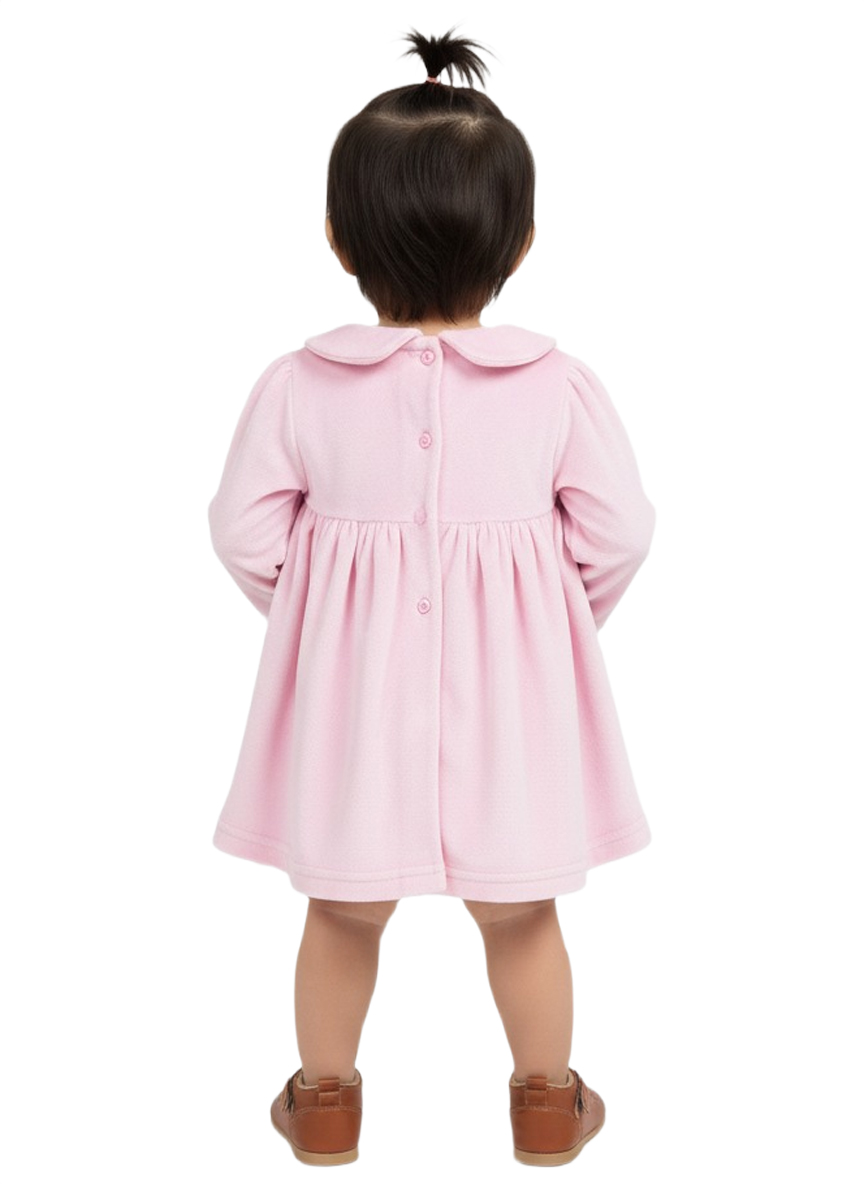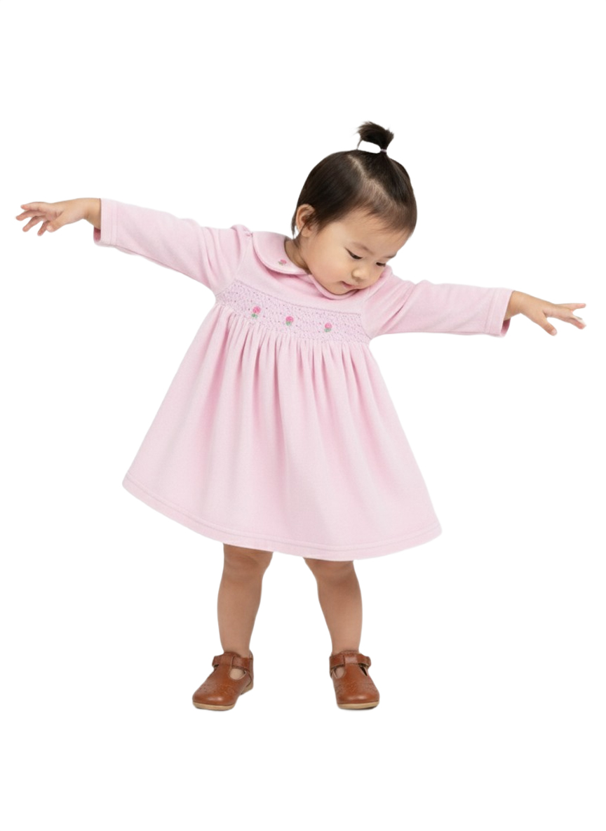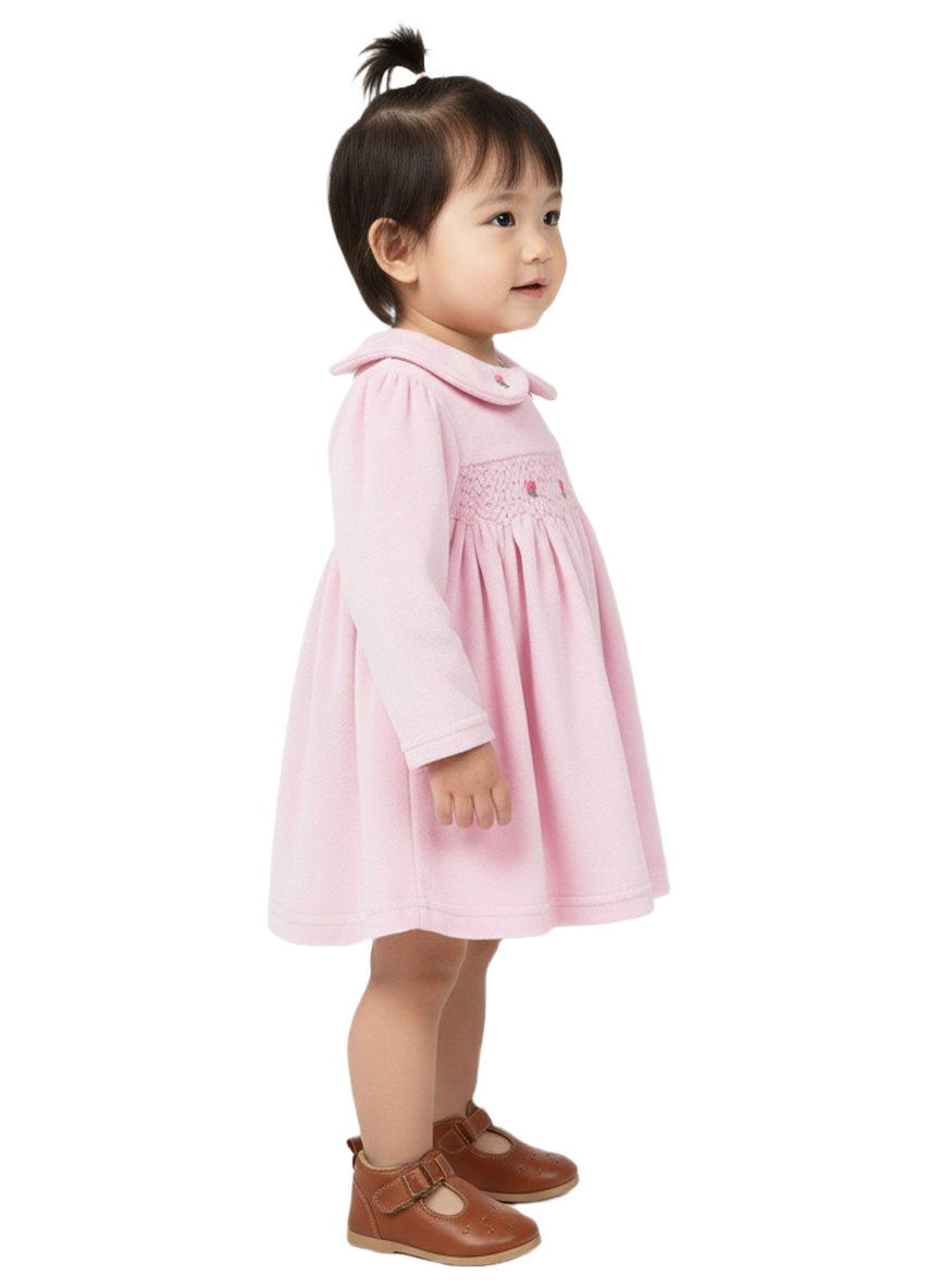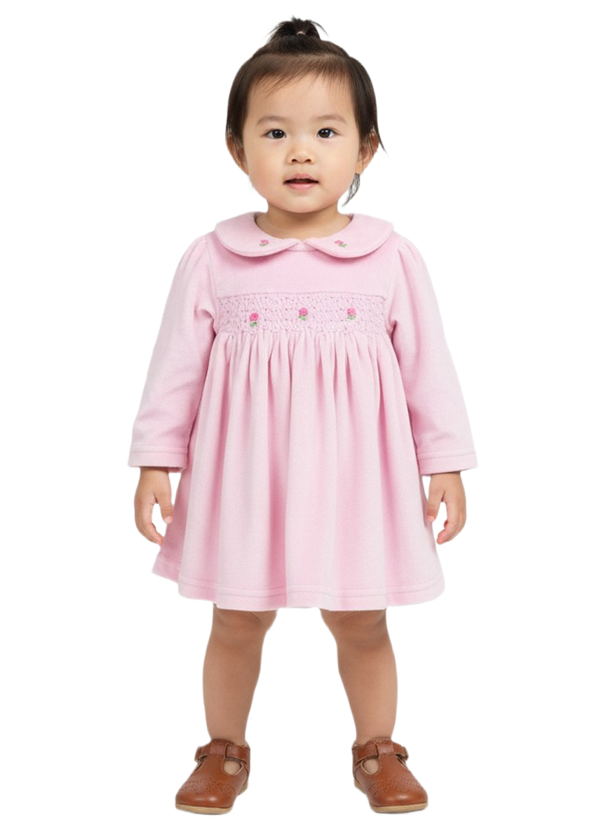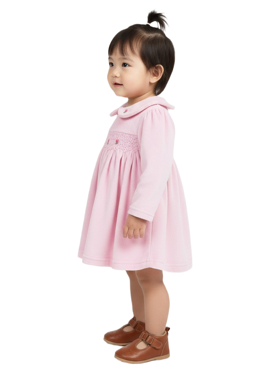 A charming soft-pink baby girl dress crafted from gentle Velvet fabric, featuring delicate smocking embroidery and a classic Peter Pan collar. Designed for comfort, elegance, and everyday cuteness.