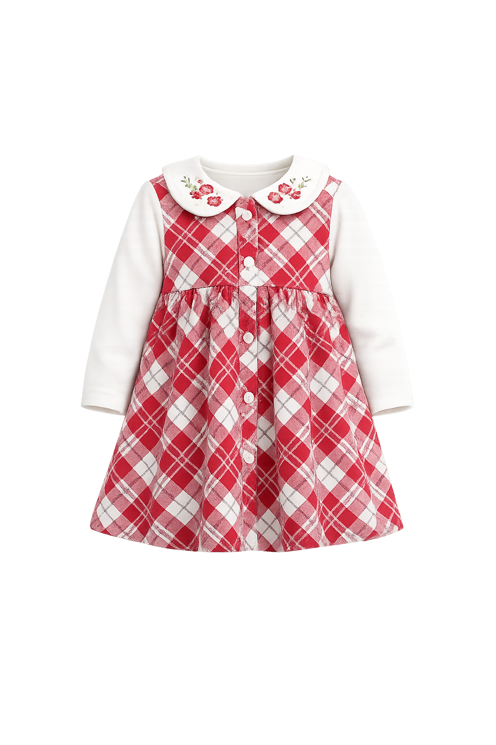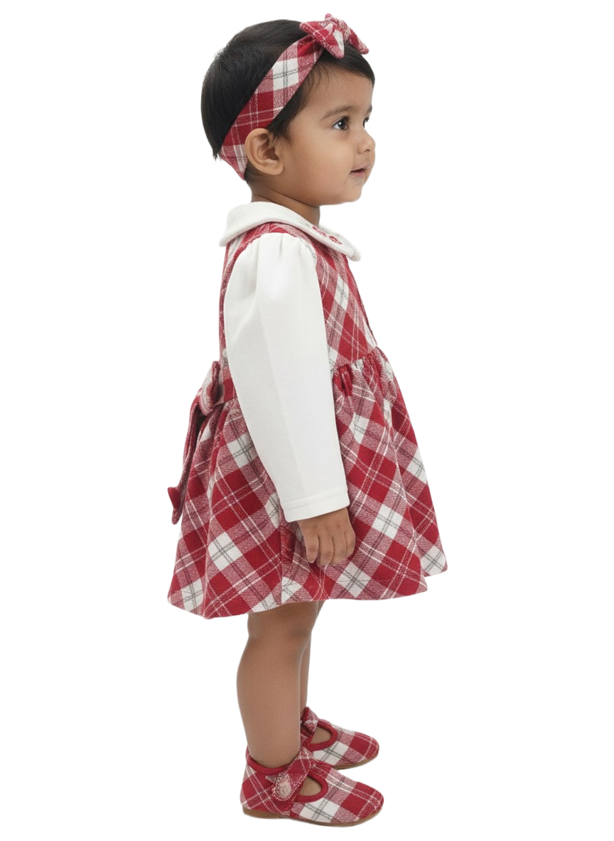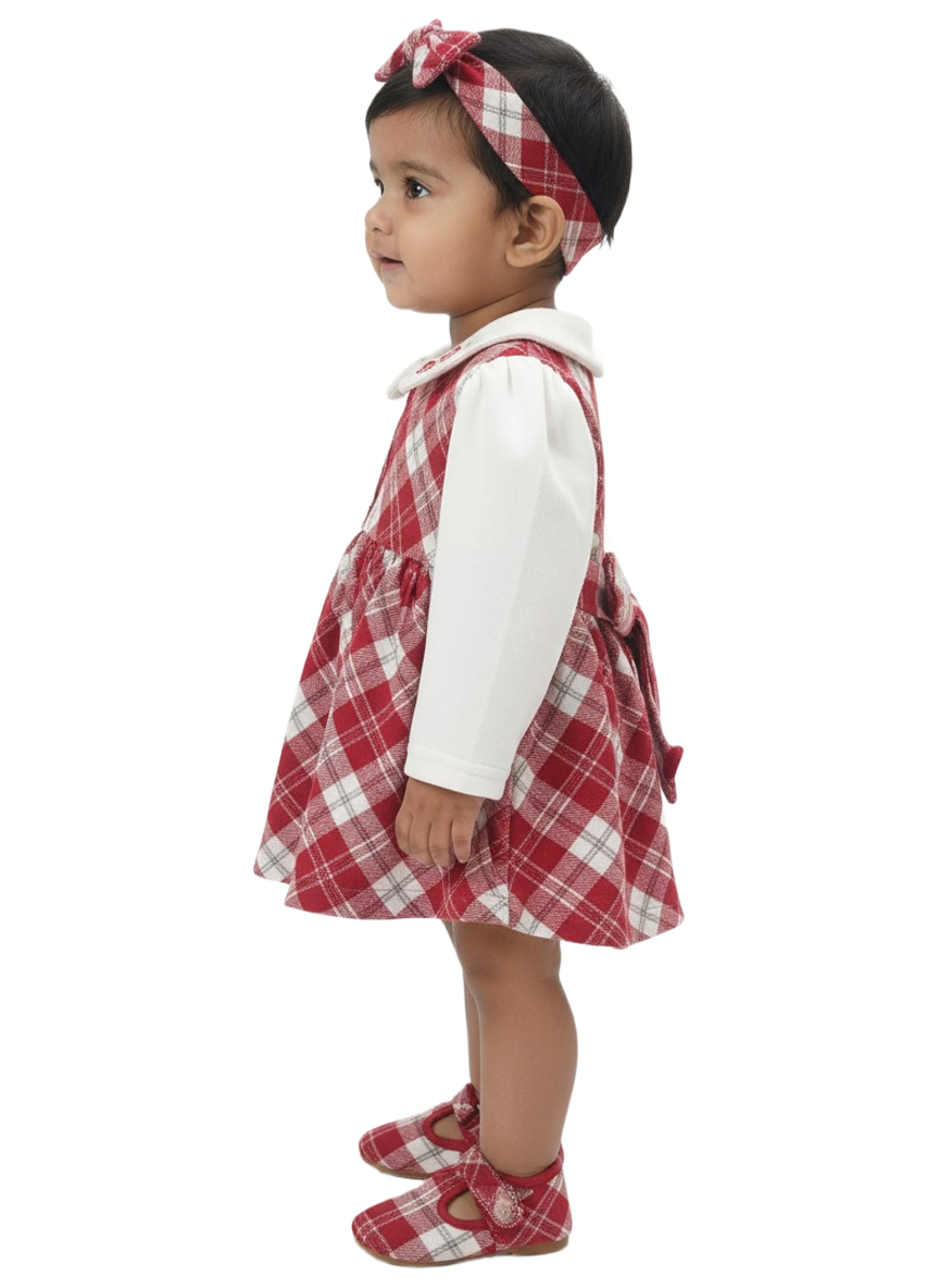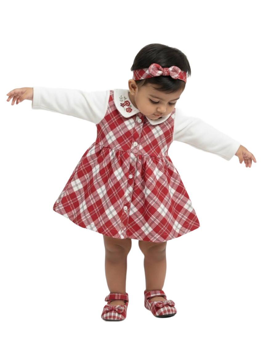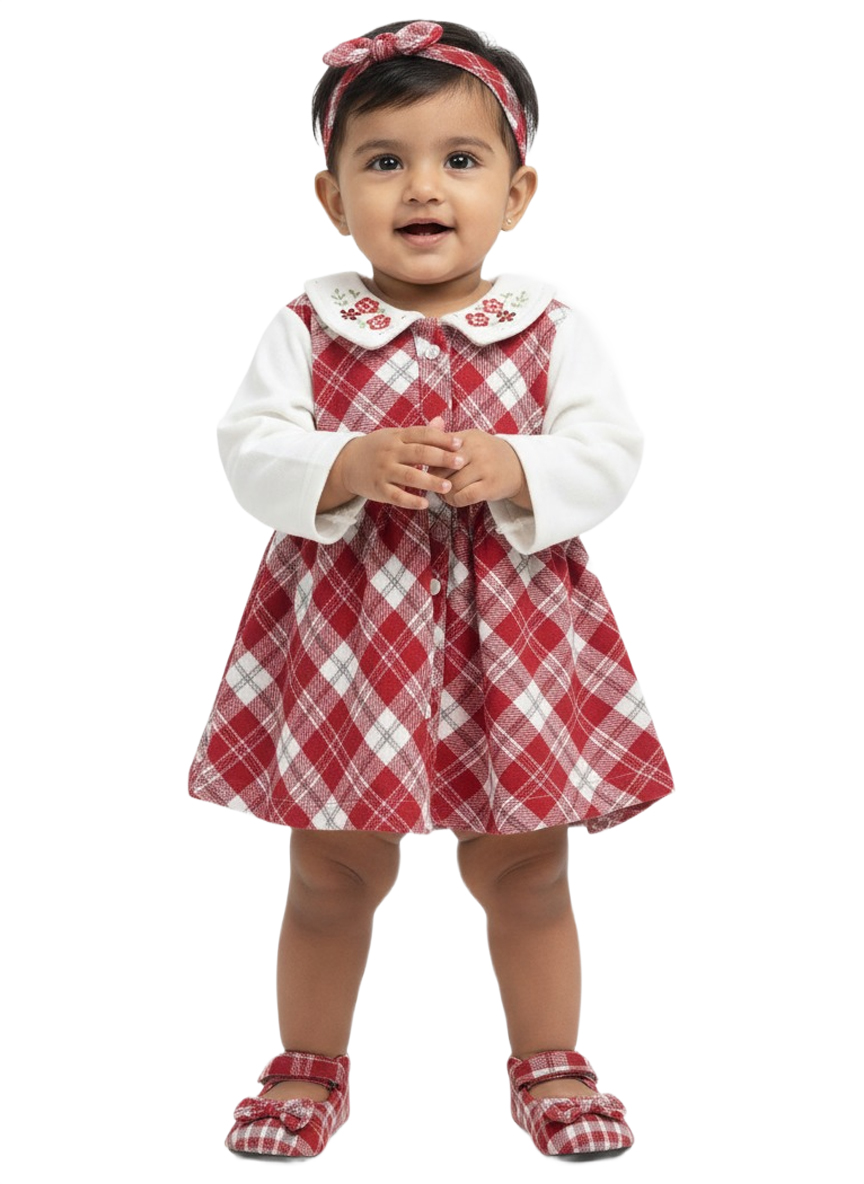 A Cozy and festive baby girl winter dress featuring a bright White bodice, classic checked skirt, soft Peter Pan collar, and cute embroidered detailing—perfect for winter occasions.