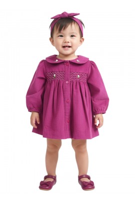 CALYX CLOTHING Pink Color Long-Sleeved Collared Dress with a Subtle Pattern and a Pleated Skirt Design | Fancy Long Frock