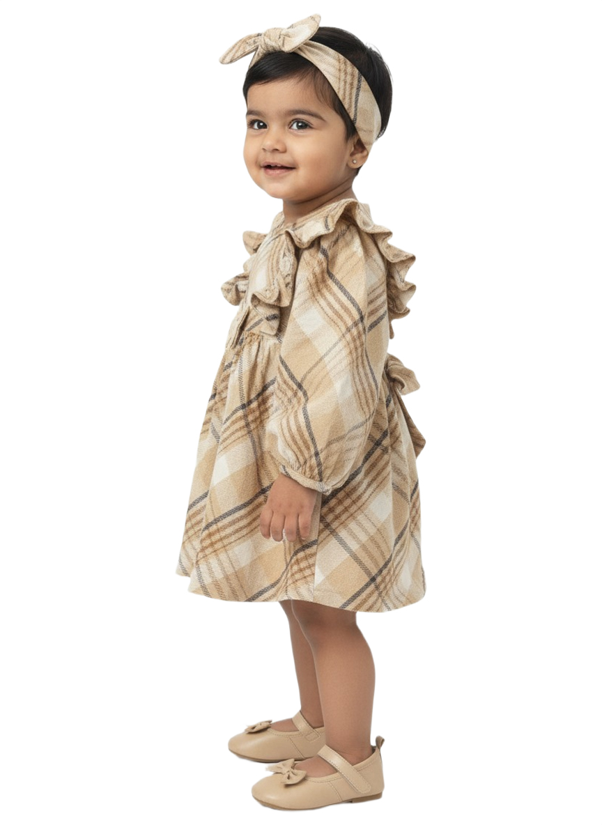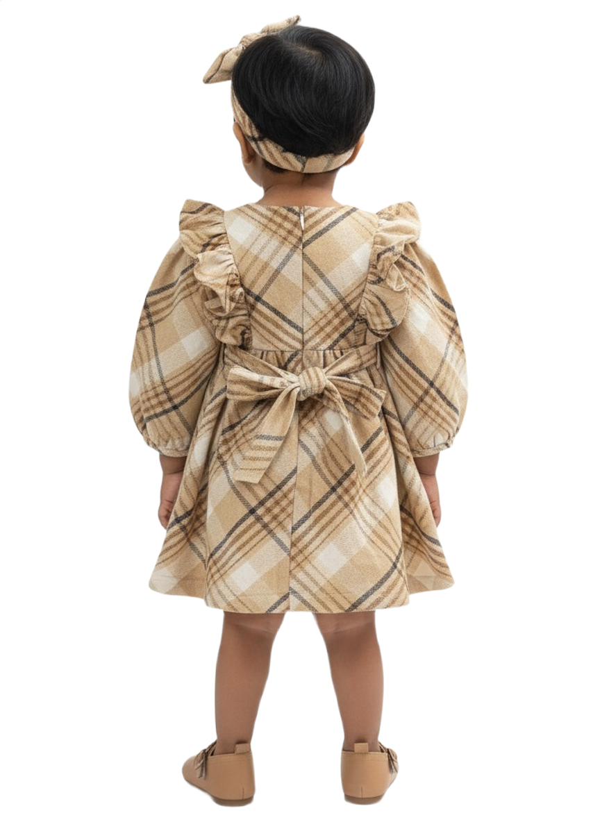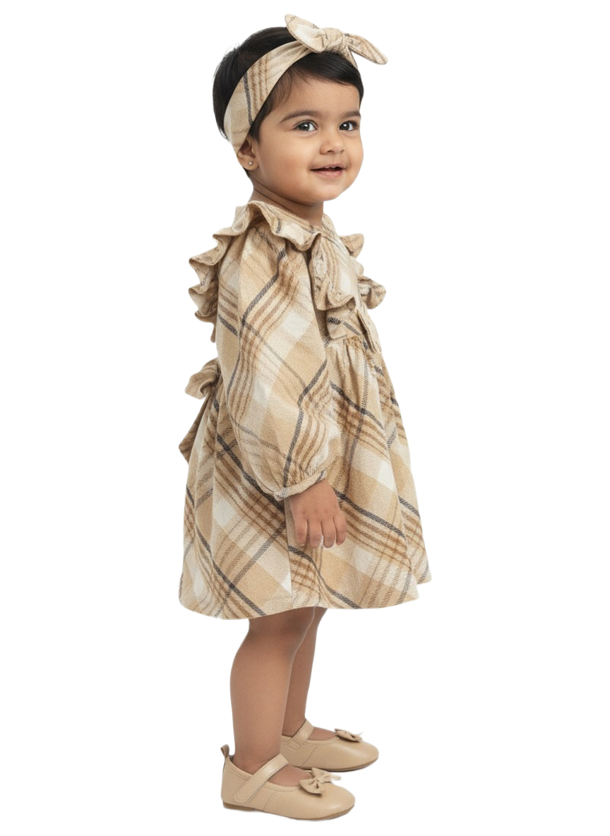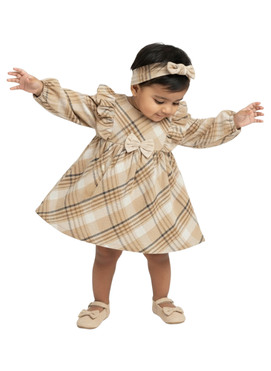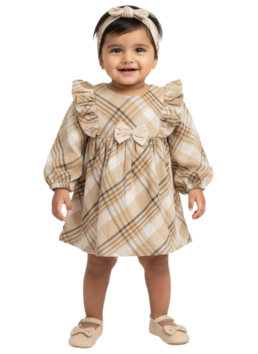 An adorable beige checked baby girl winter dress featuring soft ruffle sleeves, a front bow accent, and a comfortable flared fit—perfect for cozy, stylish winter wear.