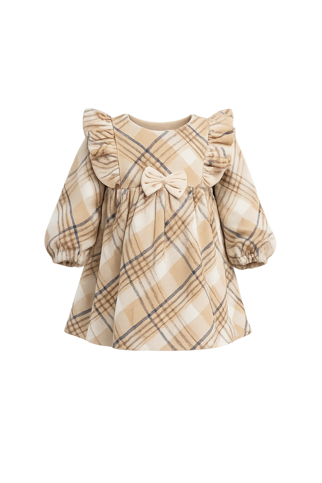 The dress showcases a classic beige checked pattern, enhanced with delicate ruffle detailing on the shoulders for added charm. A cute bow accent on the front elevates the design, while full sleeves with elastic cuffs provide warmth and ease of movement.