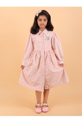 CALYX CLOTHING Pink Color Long-Sleeved Collared Dress with a Subtle Pattern and a Pleated Skirt Design | Fancy Long Frock